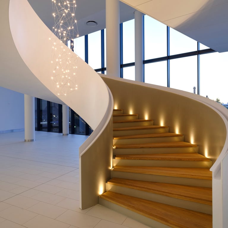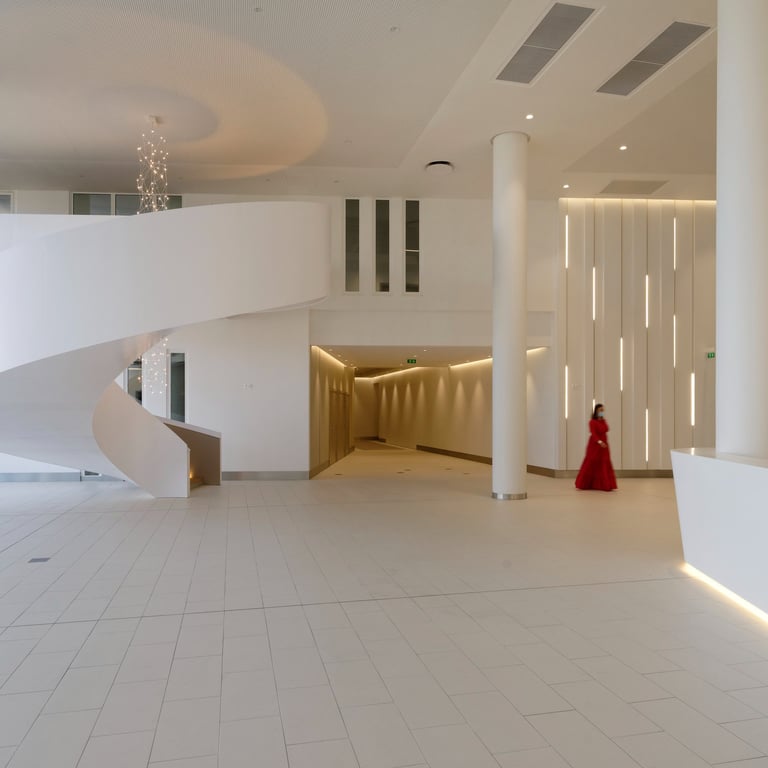 METALFIT a réalisé la mise en œuvre de la métallerie intérieure et extérieure composée de : Main-courantes, garde-corps, menuiseries feux, portes, écran acoustique en toiture, plateforme technique et un escalier architectural débillardé sans aucune fixation apparente avec une technicité élevée de par sa géométrie et son aspect architectural. Le montage à blanc dans nos ateliers a permis d’assurer une qualité optimale et une maitrise de nos délais d’interventions.