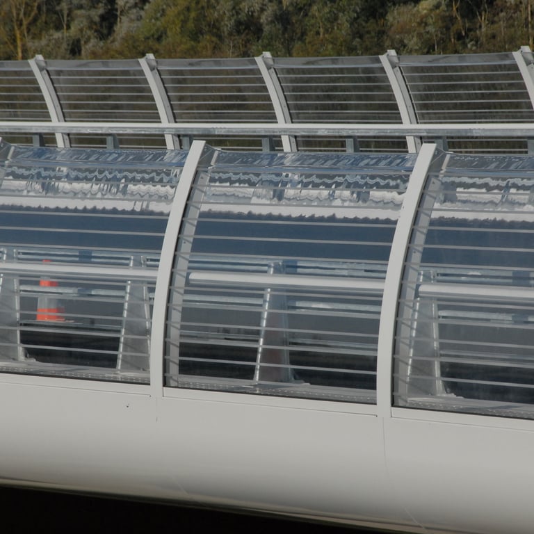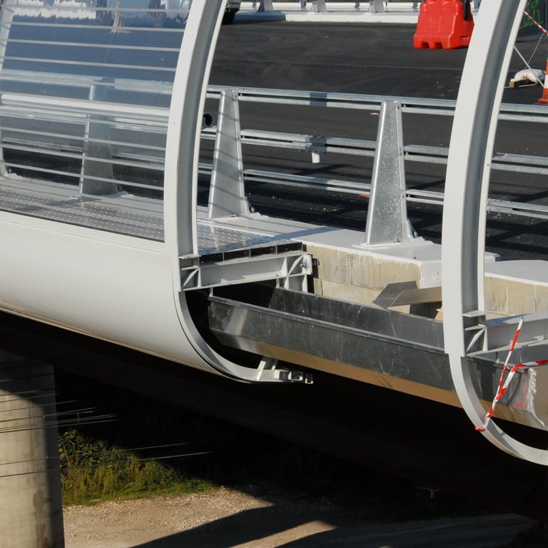 Pont-Equipement a réalisé en un temps record (10 semaines) la fourniture et la pose de 1 000 mètres linéaires de corniche caniveau avec écran antibruit en PMMA, ainsi que 1 000 mètres linéaires de corniche caniveau garde-corps. La complexité technique du projet réside dans l’écartement exceptionnellement important des supports (3,75 m contre les 2,50 m usuels) et la nécessité d'une conception entièrement en aluminium.